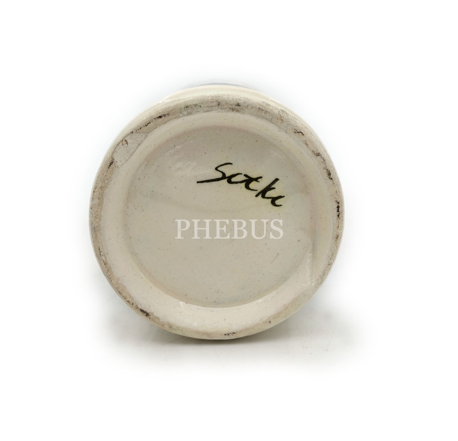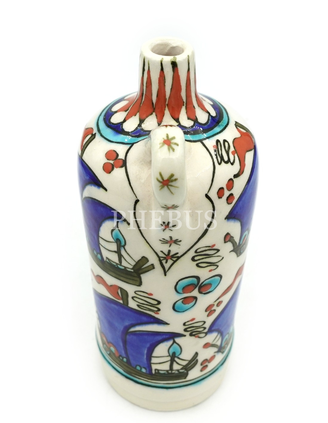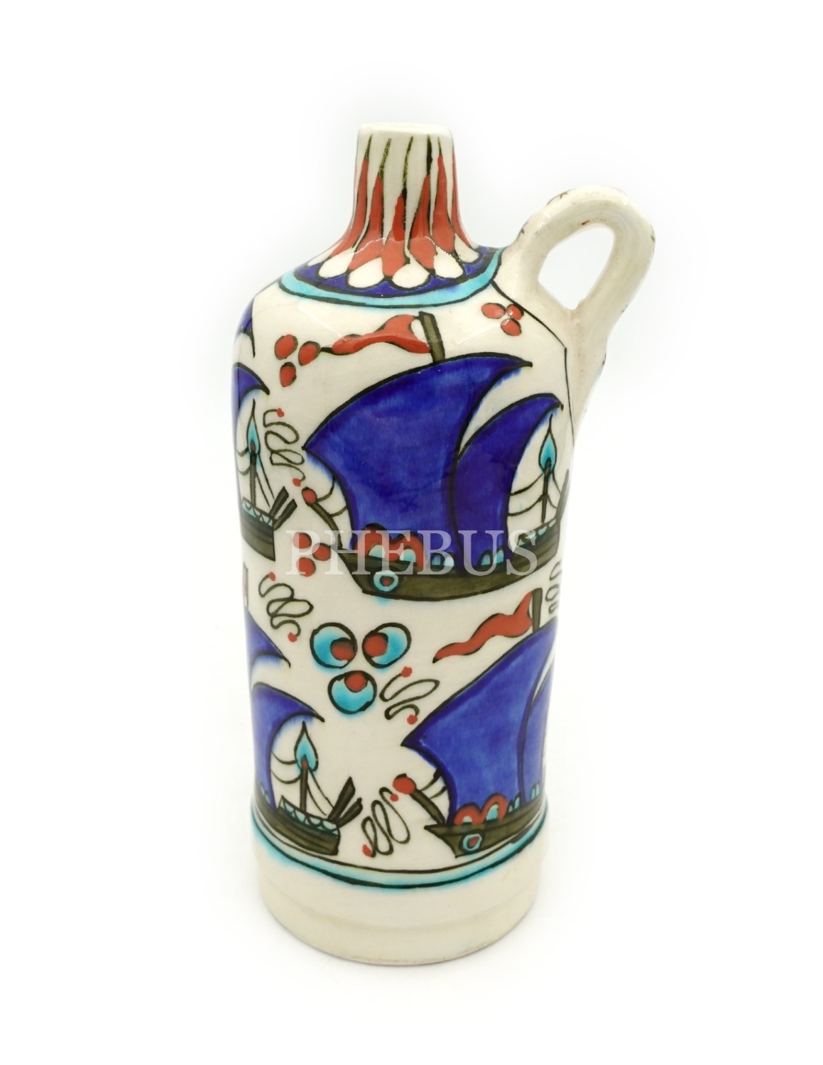 Türk çini sanatının büyük ustası Sıtkı Olçar’ın elinden çıkma, üst tarafı ufak kulplu, gövde üzeri kadırgalar ile dekorlanmış şişe.
