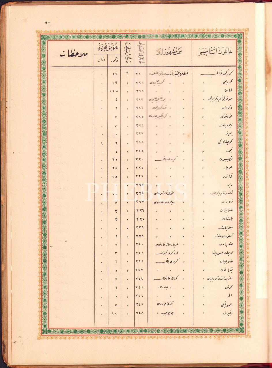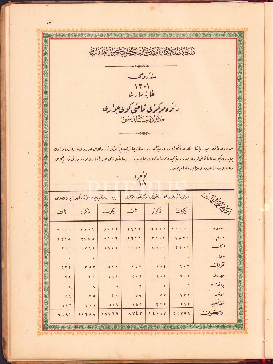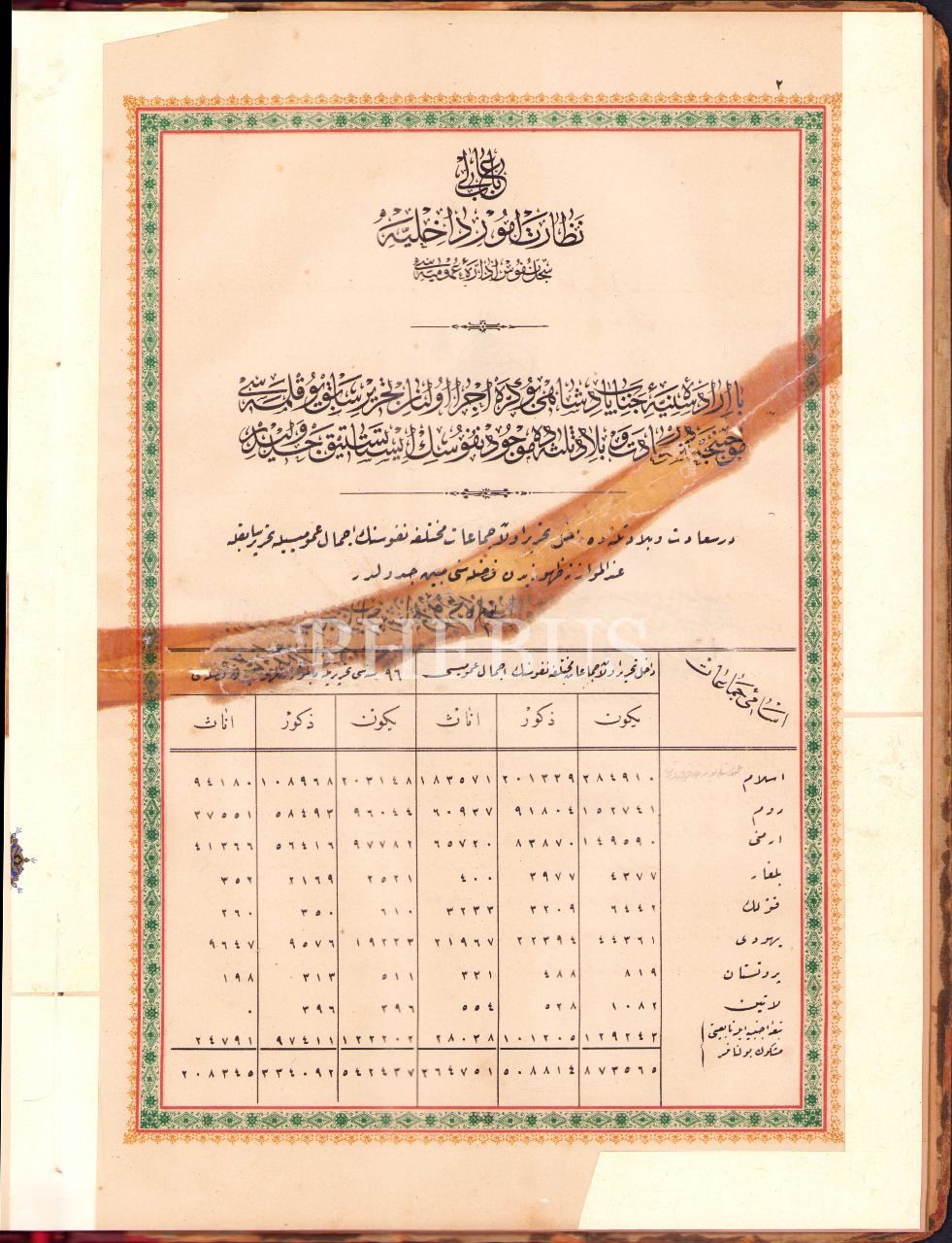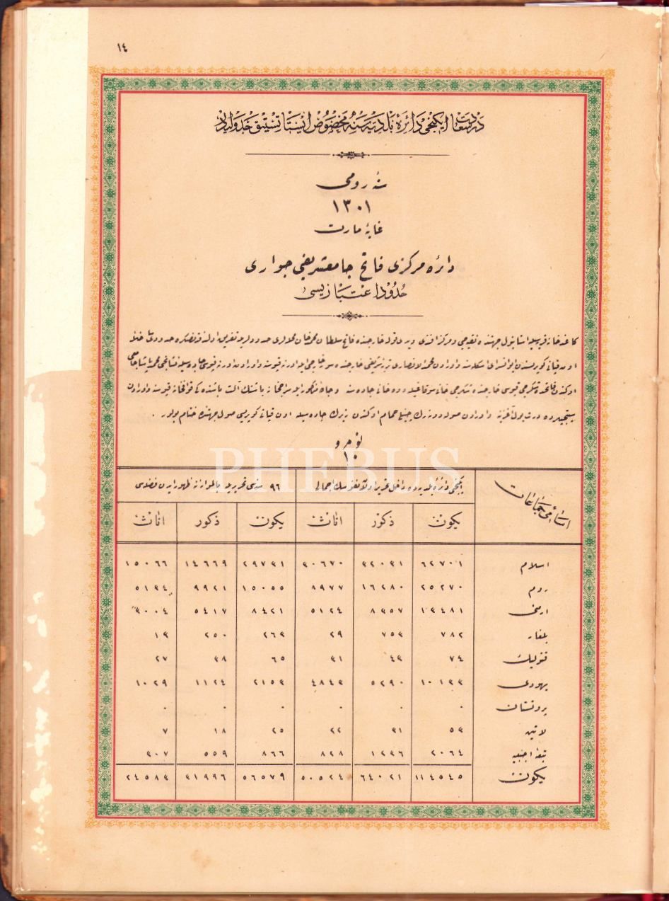 DERSAADET VE BİLÂD-I SELÂSE NÜFÛS-I UMÛMÎSİNE MAHSÛS İSTATİSTİK CEDVELİ, 1302, Osmaniye Matbaası, 94 s., 27x37 cm, bazı sayfaları tamirli ve cildi hafif yıpranmış haliyle
