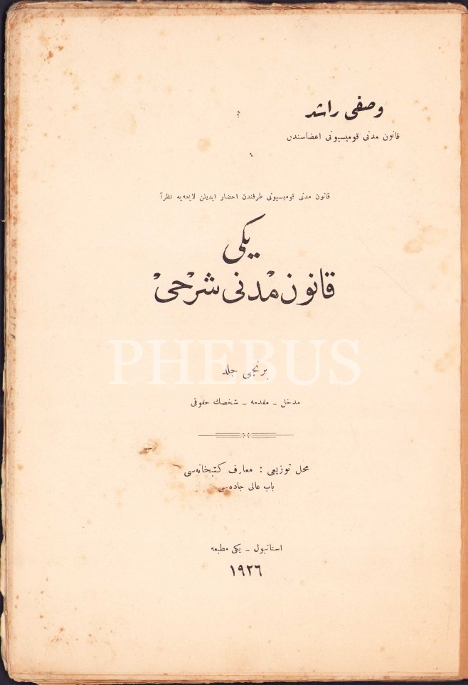 YENİ KÂNÛN-I MEDENÎ ŞERHİ [1. Cild], Vasfi Raşid, Yeni Matbaa, İstanbul 1926, 95 s., 17x25 cm, kapak sayfası hafif yıpranmış haliyle