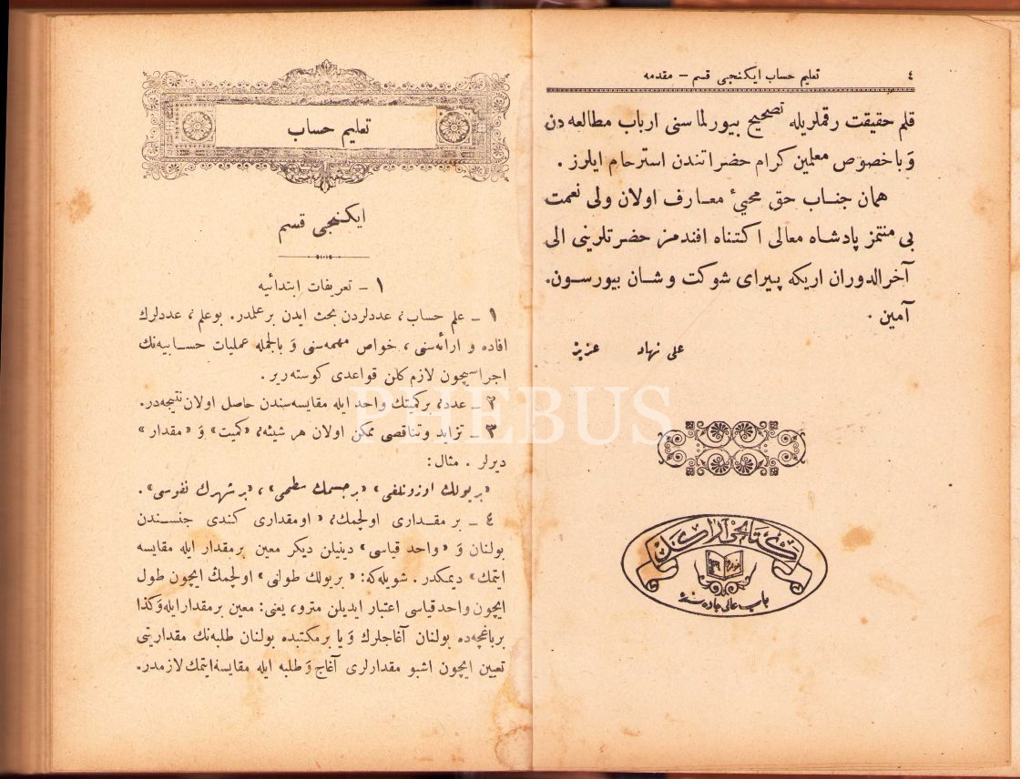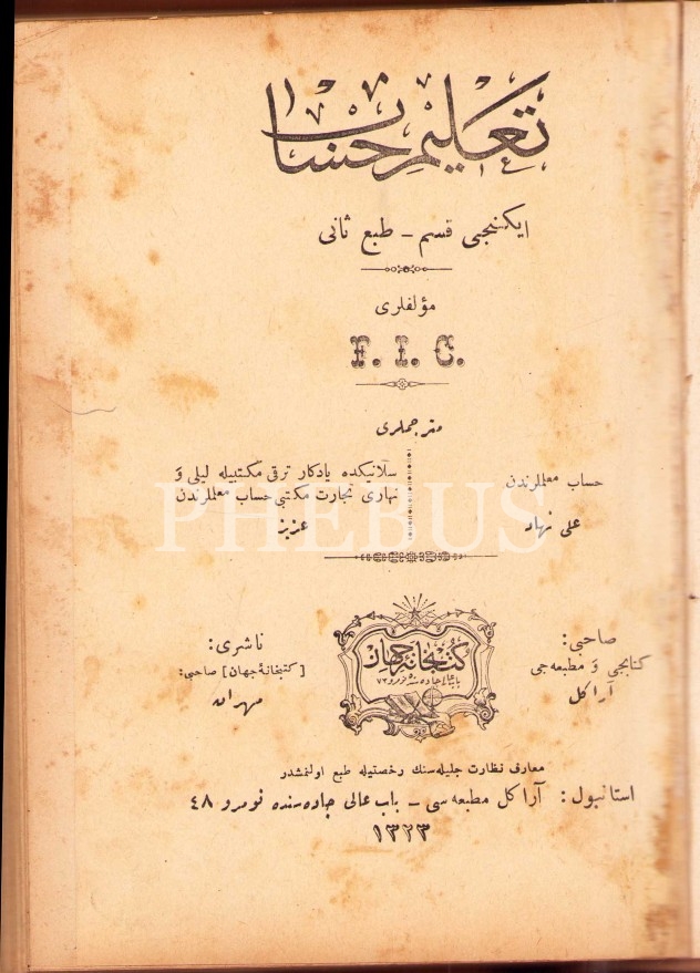 Tuğralı cildinde TA'LÎM-İ HESÂB [Matematik İşlemleri] [2 Kısım], Ali Nihad-F.I.C., Şirket-i Mürettibiye Matbaası, İstanbul 1315, 87+448 s., 14x19 cm