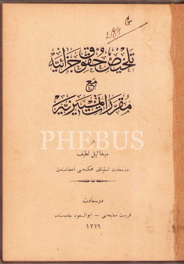 TELHÎSU HUKÛK-I CEZÂİYYE MAA MUKARRERÂT-I TEMYÎZİYYE [Temyiz Kararları İle Özet Ceza Hukuku] Mihail Latif, Karabet Matbaası, Dersaadet [İstanbul] 1329, 142 s., 15x20 cm