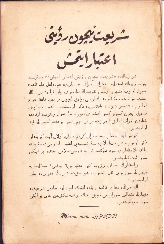 ŞERÎAT NİÇİN RÜ'YETİ İ'TİBÂR ETMİŞ, Musa Carullah, Kazan, 110 s., 15x22 cm