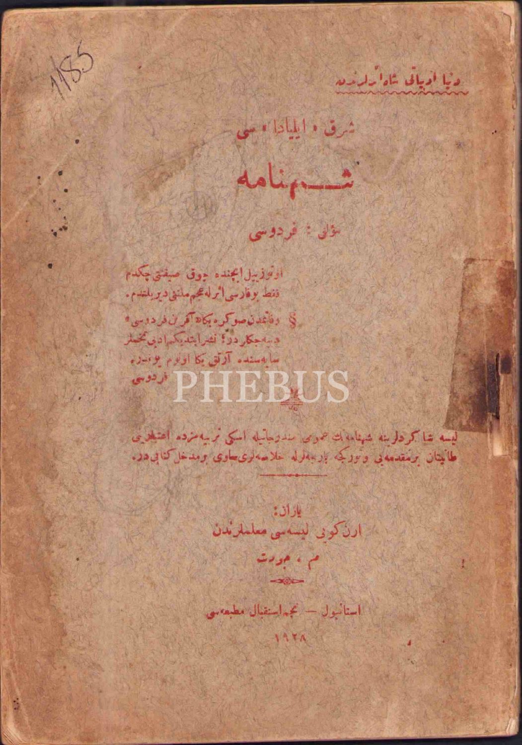 Şark "İlyada"sı ŞEHNÂME, Firdevsî, haz. M. Cevdet, Necm-i İstikbal Matbaası, İstanbul 1928, 88 s., 13x19 cm, su almış ve kapağı hafif yıpranmış haliyle