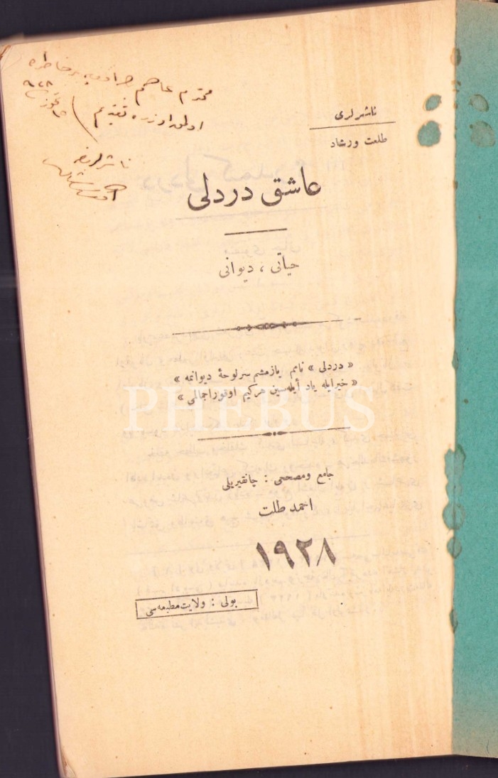 ÂŞIK DERDLİ (Hayatı, Dîvânı), yayıncılarından ithaflı ve imzalı, Vilayet Matbaası, Bolu 1928, 165 s., 15x22 cm, kapak sayfası yıpranmış haliyle