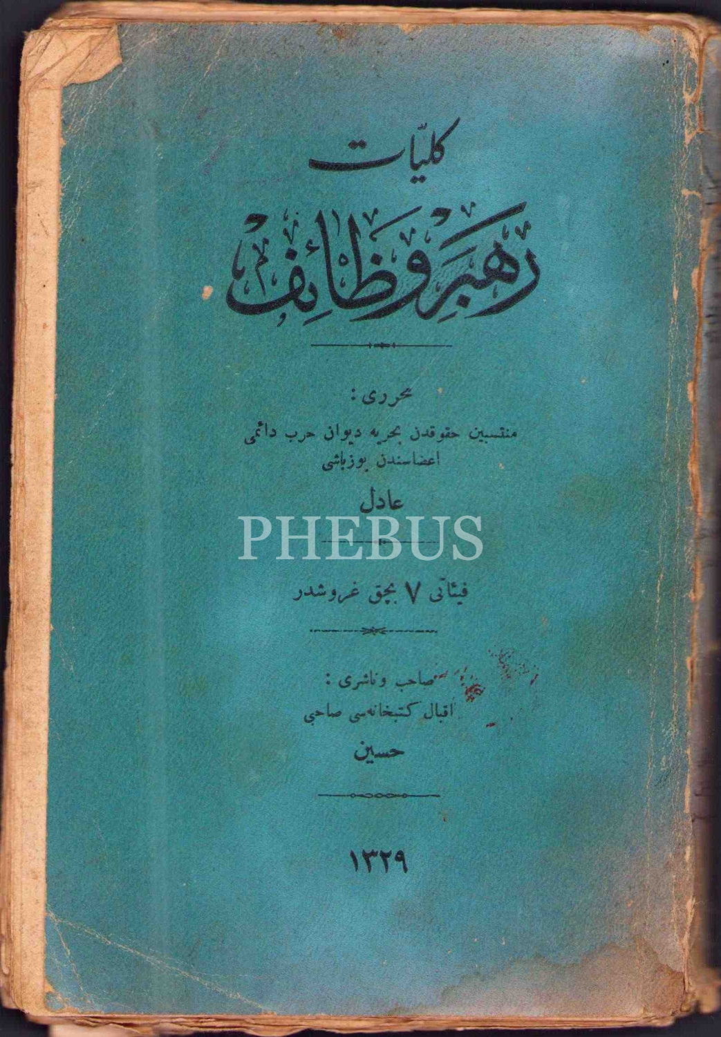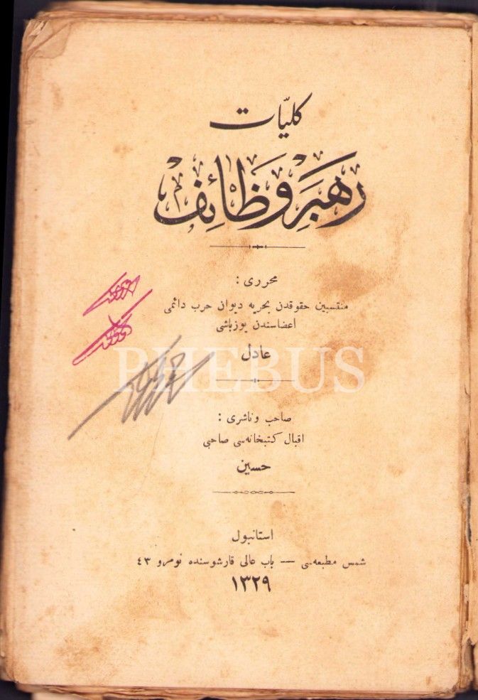 KÜLLİYYÂT-I REHBER-İ VEZÂİF, Adil, Şems Matbaası, İstanbul 1329, 179 s., 13x19 cm, kapağı yıpranmış haliyle