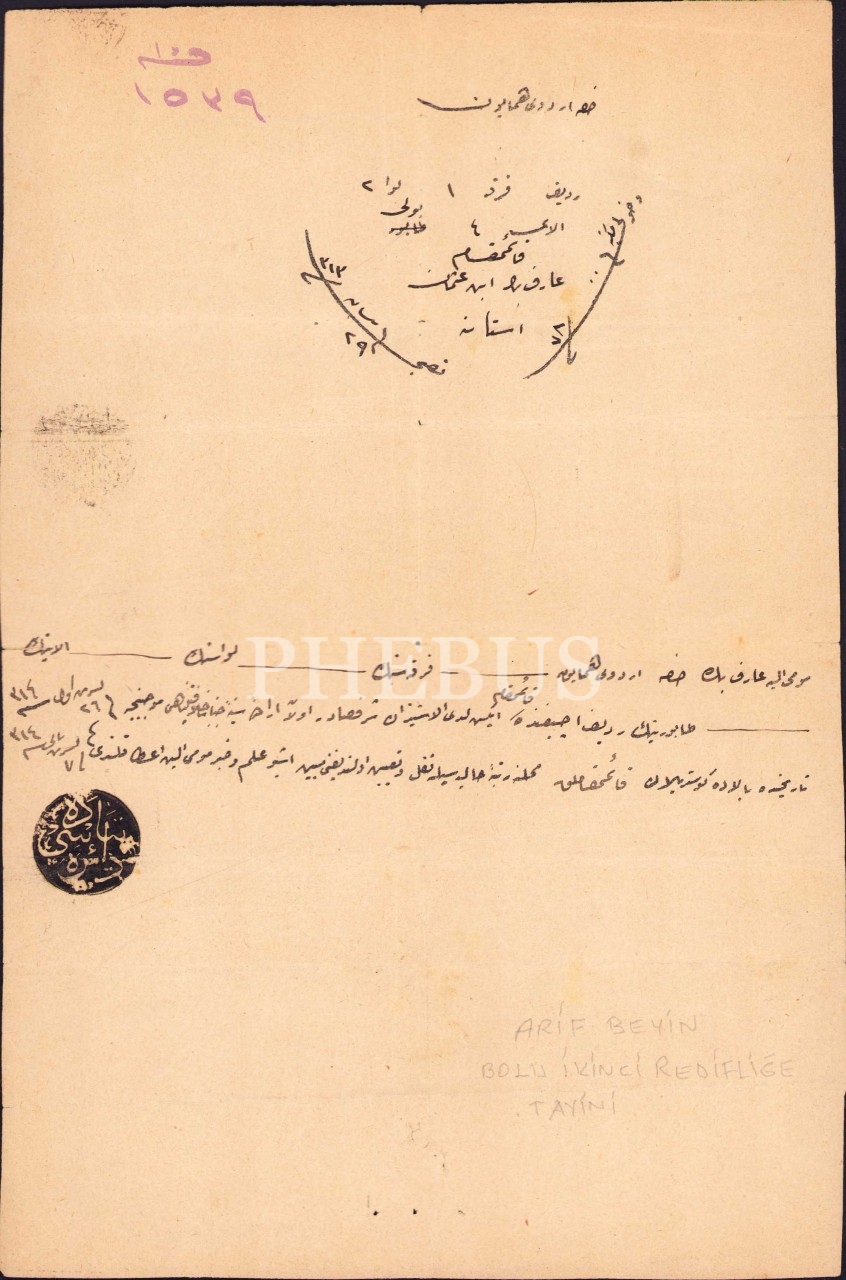 Hassa Ordu-yı Hümayun'dan Kaymakam Arif Bey'e ait 1314 tarihli Osmanlıca nakil ve tayin belgesi, 18x27 cm, kenarları hafif yırtık haliyle