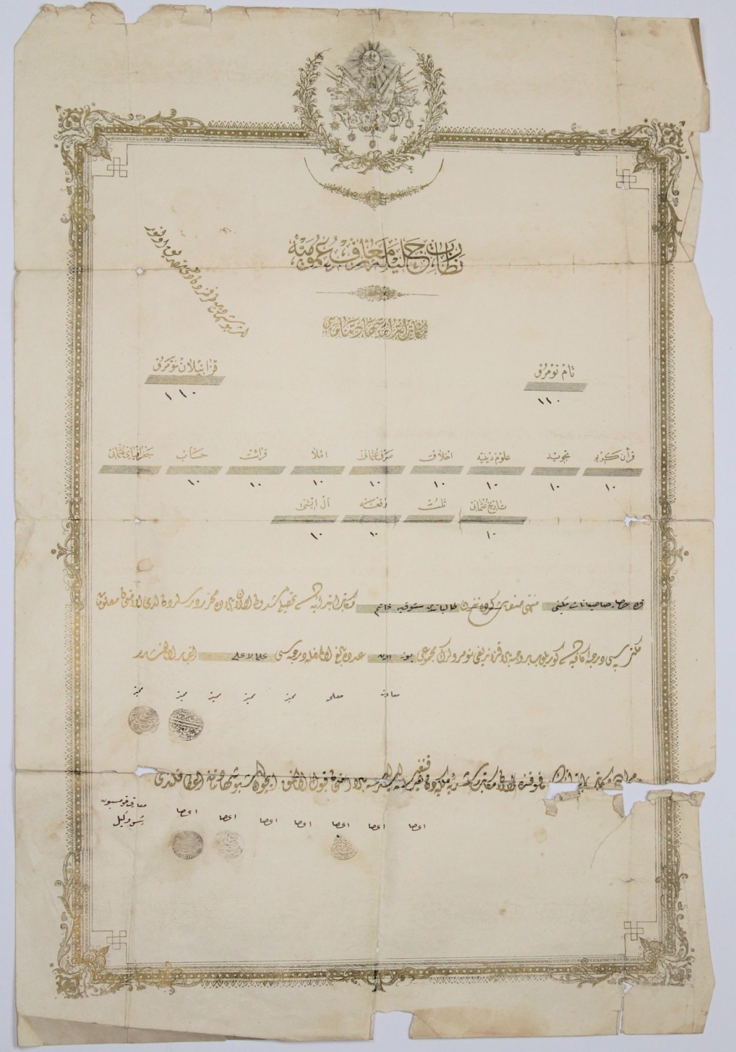 Osmanlı Karahisar Sahib İnas Mektebine ait diploma, haliyle, 34x50cm