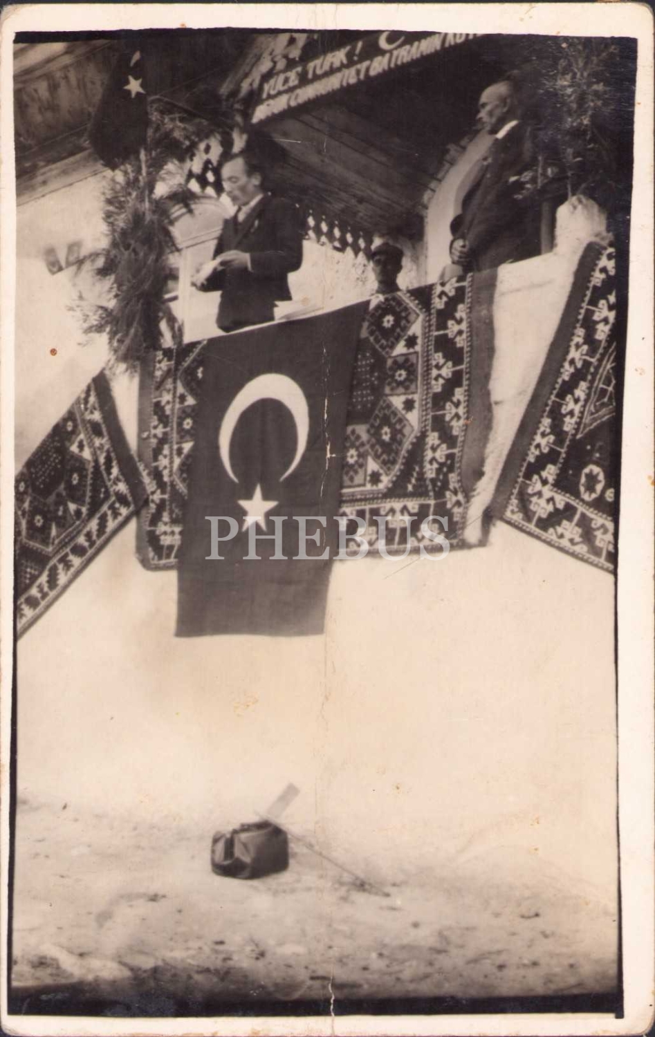 Türk bayrakları ile süslenmiş binada Cumhuriyet bayramı kutlaması, ortadan kırık haliyle