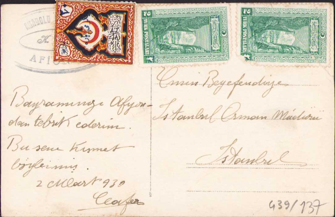 Afyon, postadan geçmiş, İstanbul adresli, pullu, damgalı, 9x14cm