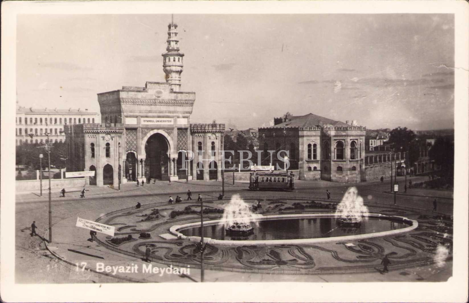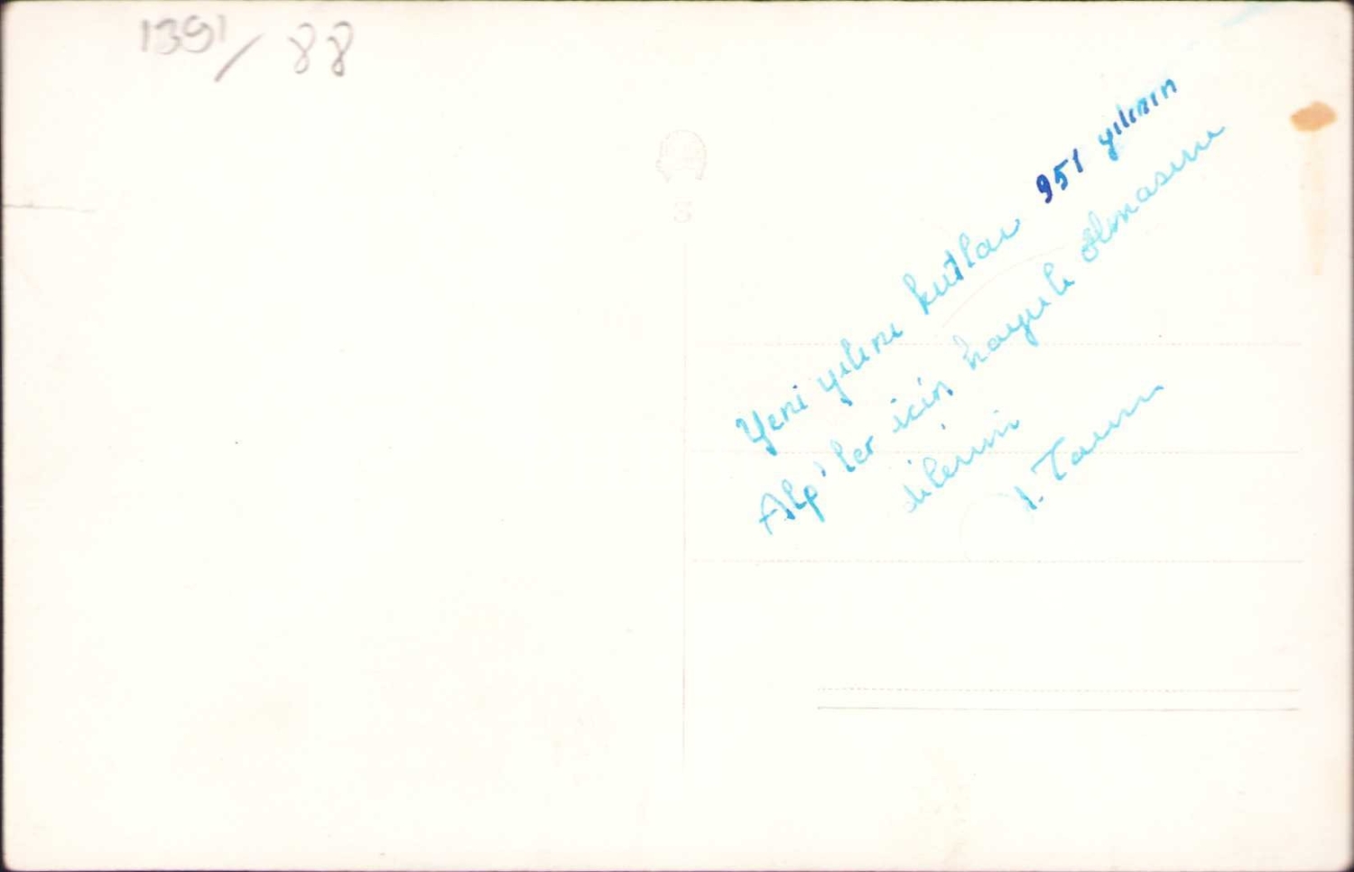 Beyazıt Meydanı görseli arkasında 1951 tarihli yeni yıl tebrik mektubu, bir kenarı yırtık haliyle