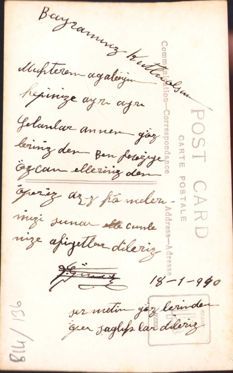 Çorum Sıhhat Okulu görseli arkasında 1940 tarihli bayram tebrik mektubu