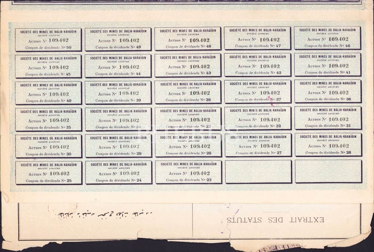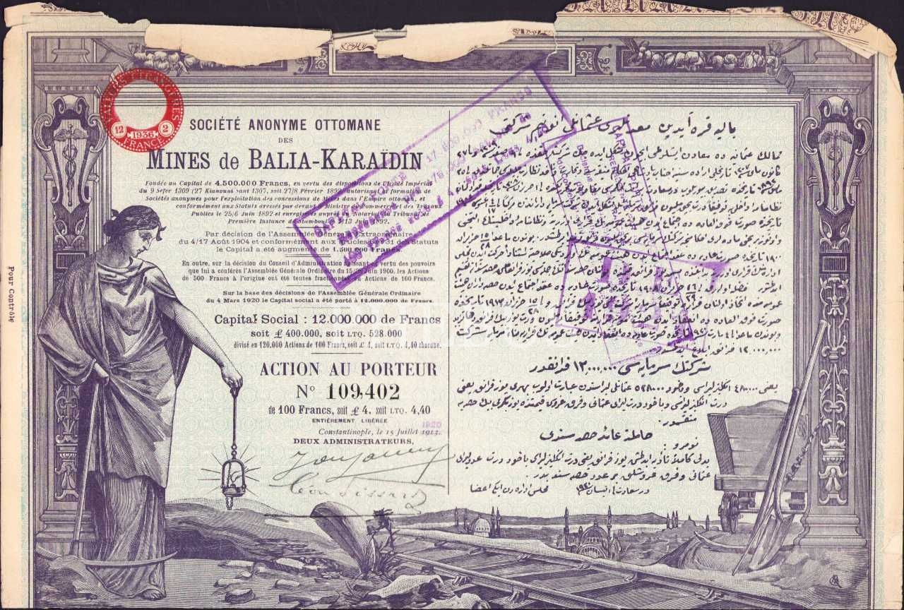 Balya Karaaydın Madenleri Osmanlı Anonim Şirketi'ne ait Osmanlıca-Fransızca hisse senedi, 31x37 cm