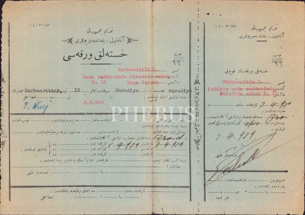 Anadolu-Bağdad Demiryolları antetli Osmanlıca hastalık belgesi, 1929 tarihli, 19x26 cm