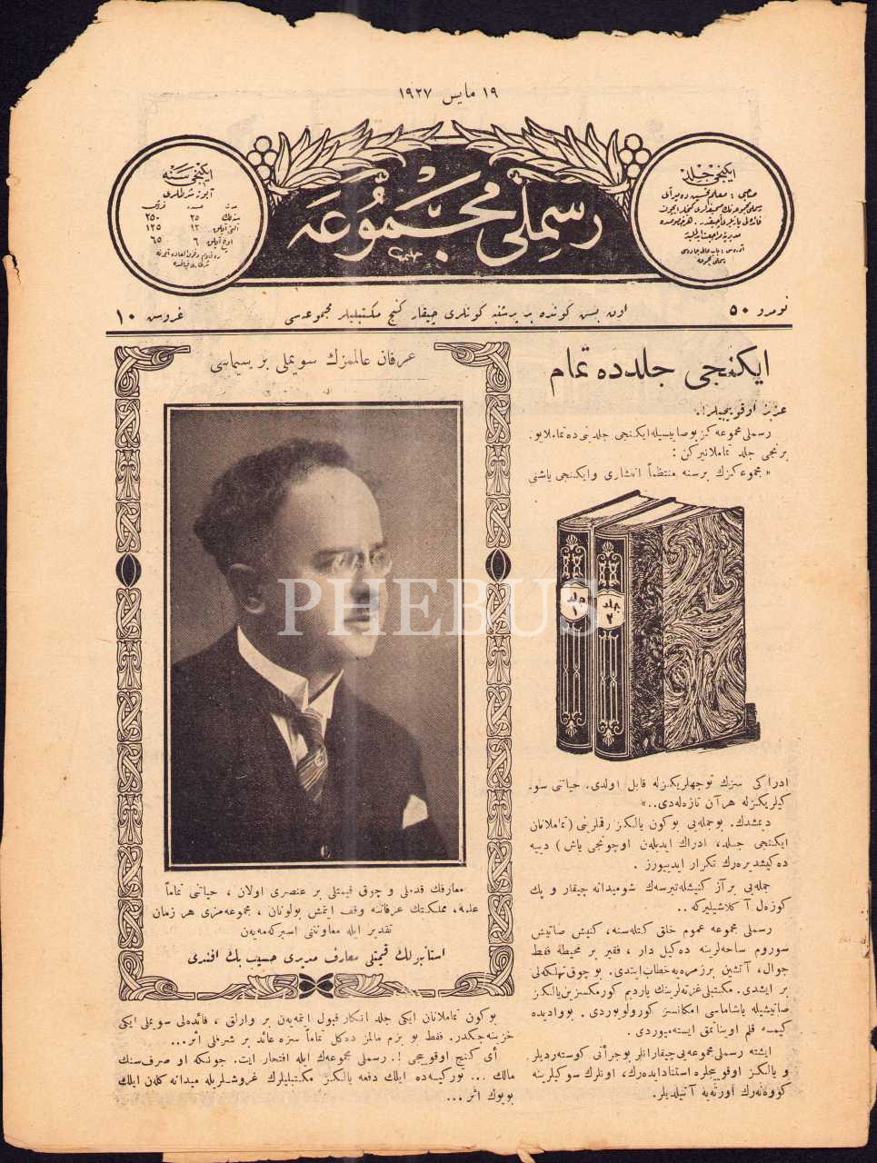 Osmanlıca Resimli Mecmua'nın 50. sayısı, 19 Mayıs 1927, "İrfan âlemimizin sevimli bir siması: İstanbul Maarif Müdürü Hasib Beyefendi"ye ait iç kapak görseliyle, 23x30 cm, kapak sayfaları ayrık haliyle