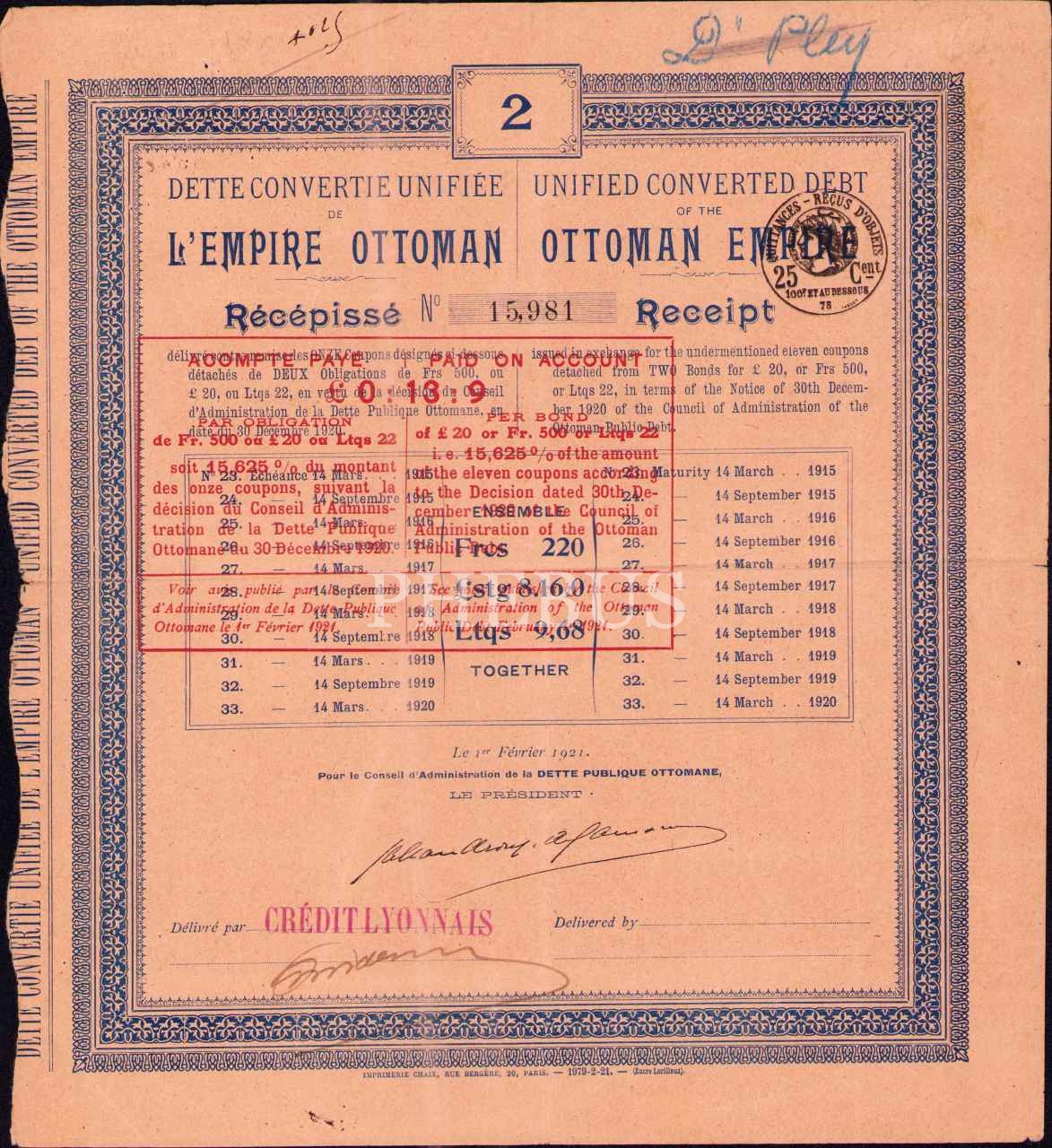 Osmanlı İmparatorluğu'nun Fransızca-İngilizce borç makbuzu, 25x27 cm