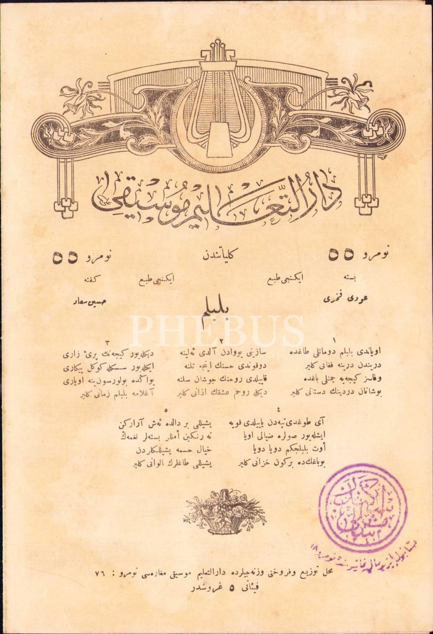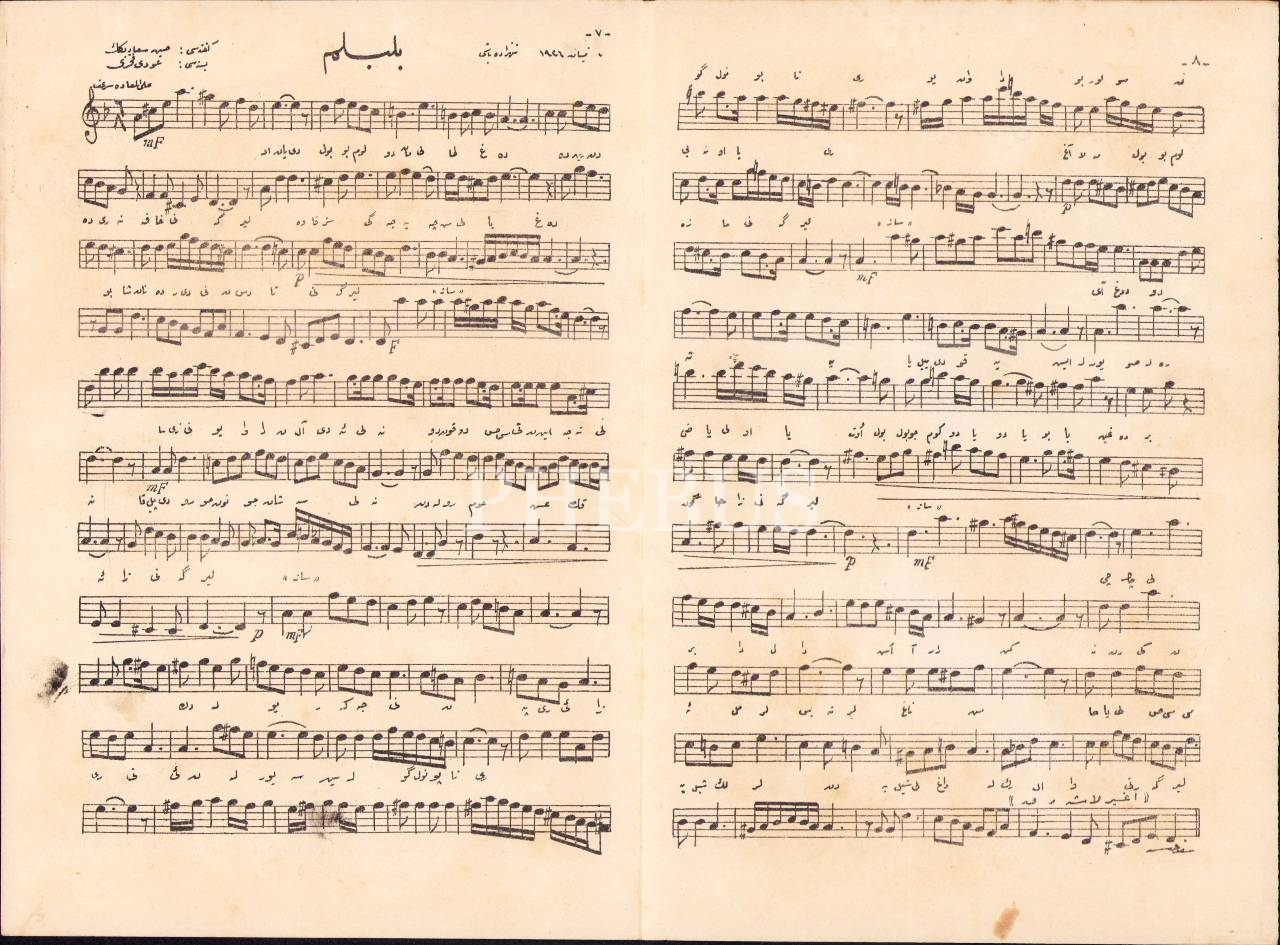 Osmanlıca Darü't-Talim-i Musiki külliyatından Bülbülüm notası, 17x25 cm