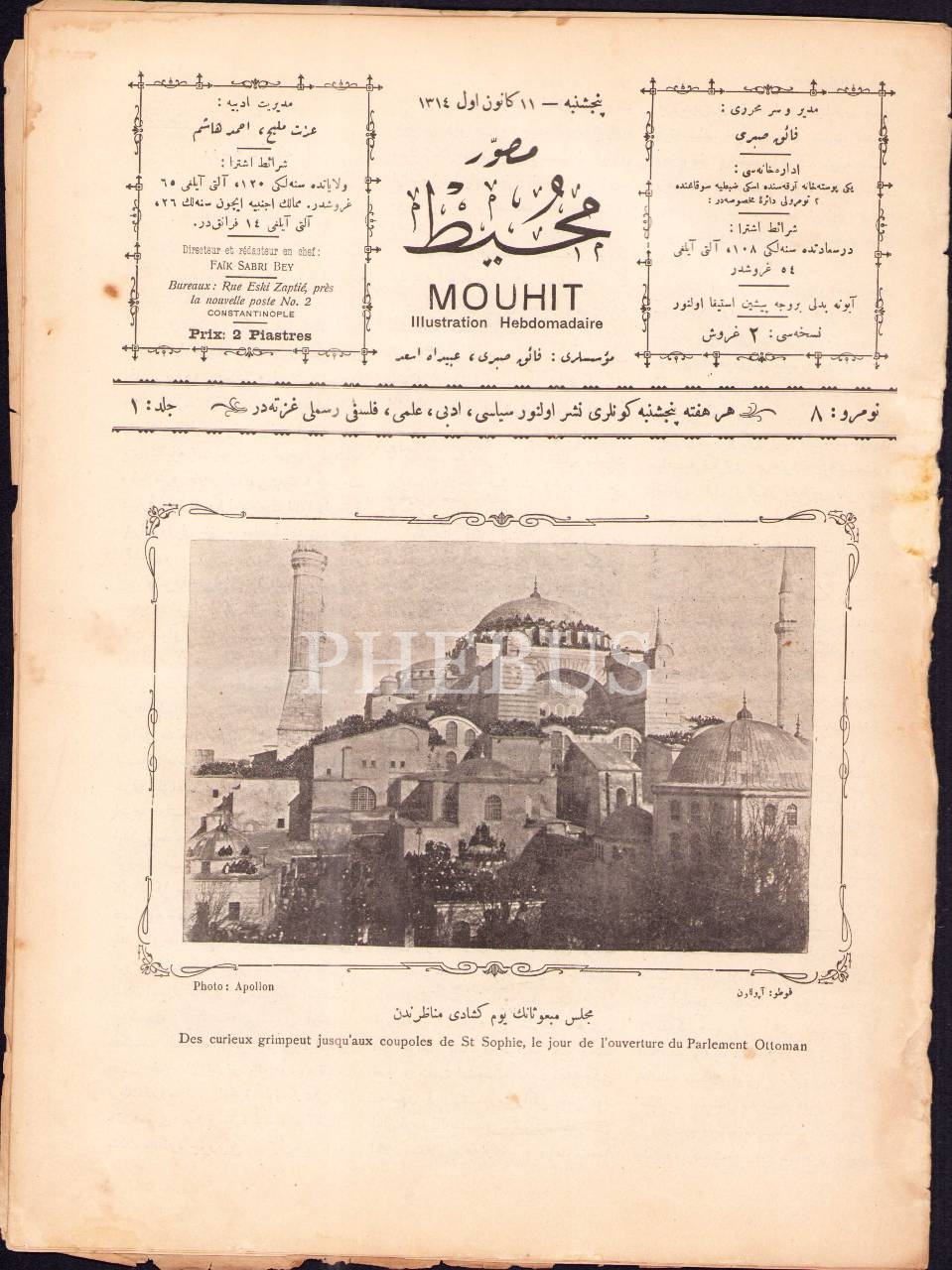 Osmanlıca Musavver Muhit dergisinin 8. sayısı, 11 Kanunuevvel 1314, "Meclis-i Mebusan'ın açılış günü manzaralarından" başlıklı ön kapak görseliyle, 24x33 cm