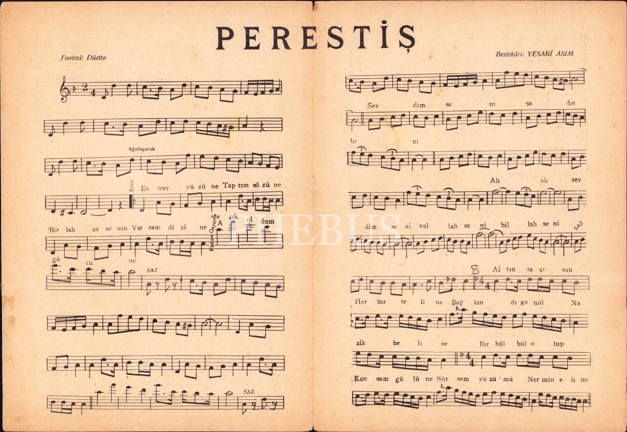 Kudmanizade Şamlı İskender yayınlarından Yesari Asım'a ait Perestiş notası, 17x24 cm