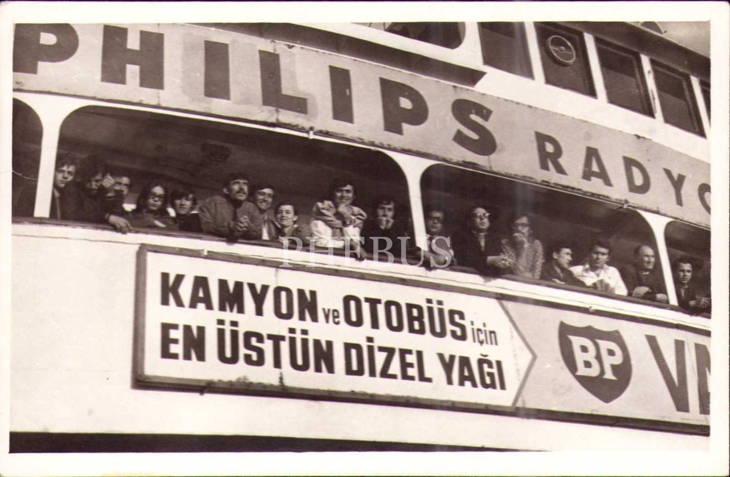 Philips Radyo ve BP Dizel Yağı reklamlı vapurda topluluk hatıra fotoğrafı
