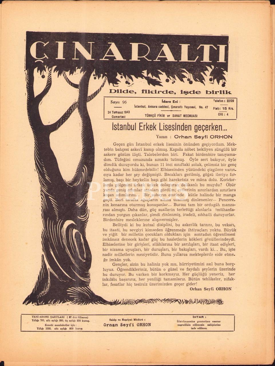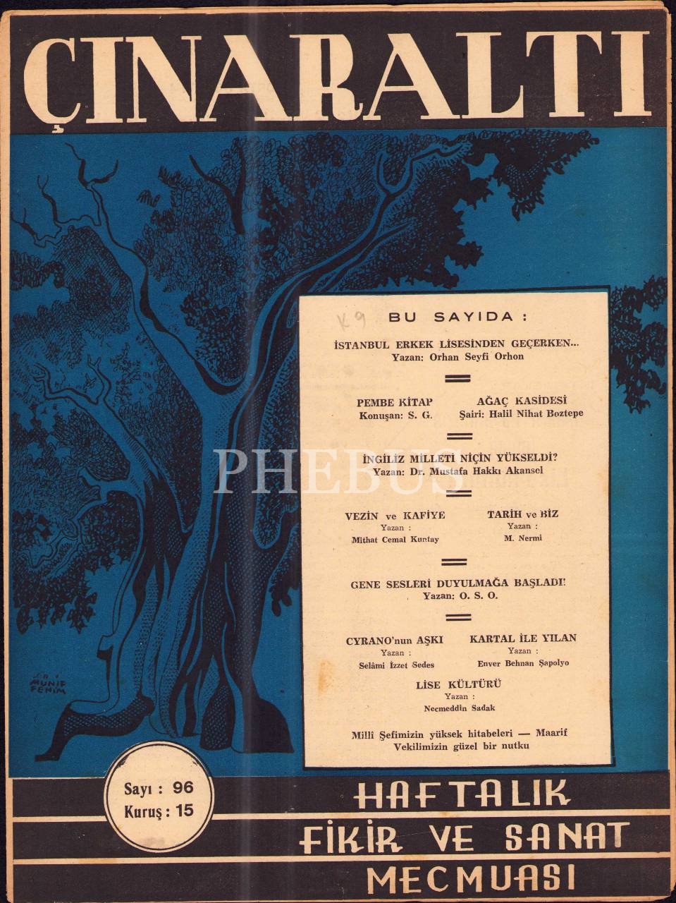 "Türkçü Fikir ve Sanat Mecmuası" Çınaraltı'nın Münif Fehim imzalı kapak görseliyle 96. sayısı, 24 Temmuz 1943, 24x32 cm