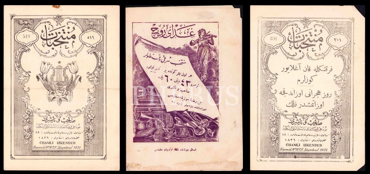 Kudmanizade Şamlı İskender ve Ali Rıza Muzika Mağazası yayınlarından 3 adet Osmanlıca nota, 14x20 cm