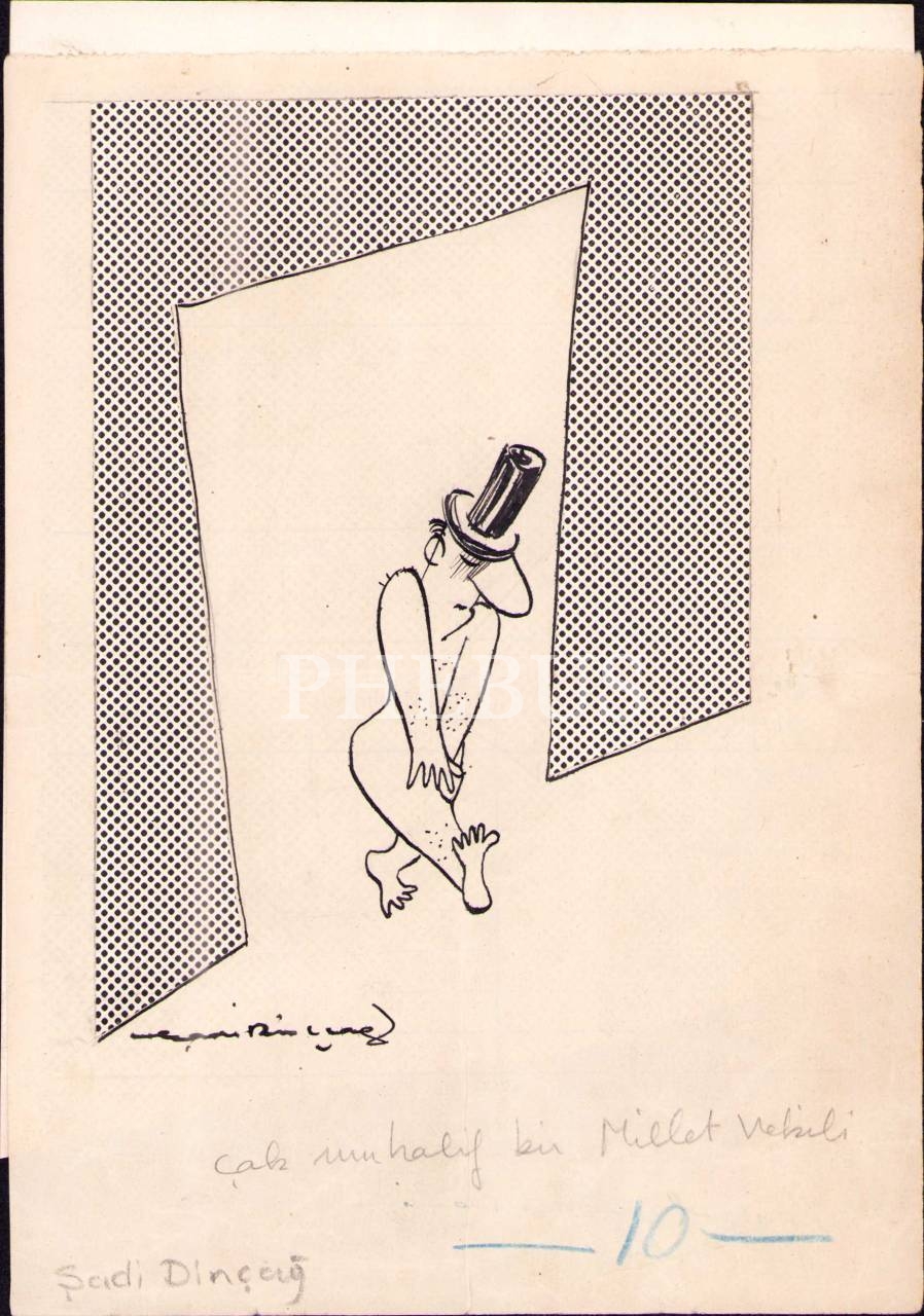Karikatürist Şadi Dinççağ imzalı orijinal karikatür çizimi, 15x21 cm