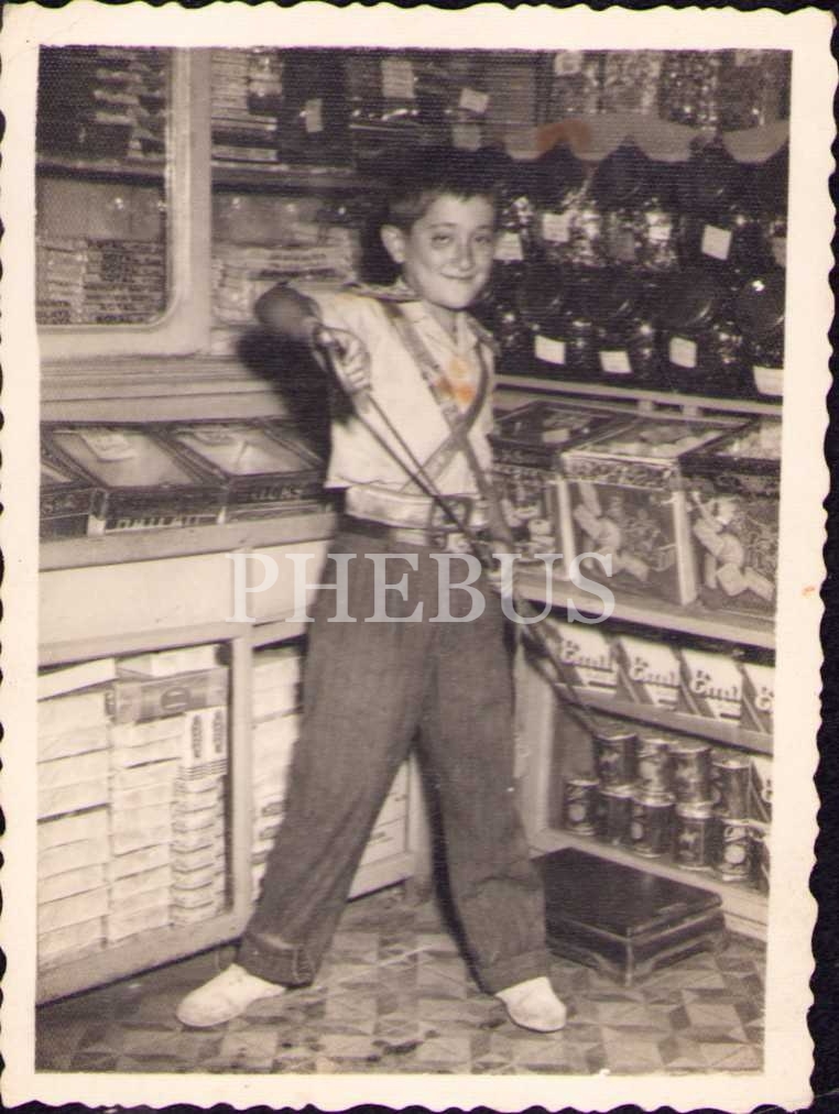 Kuruyemiş dükkânında kılıcıyla poz veren erkek çocuğu, 6x8 cm