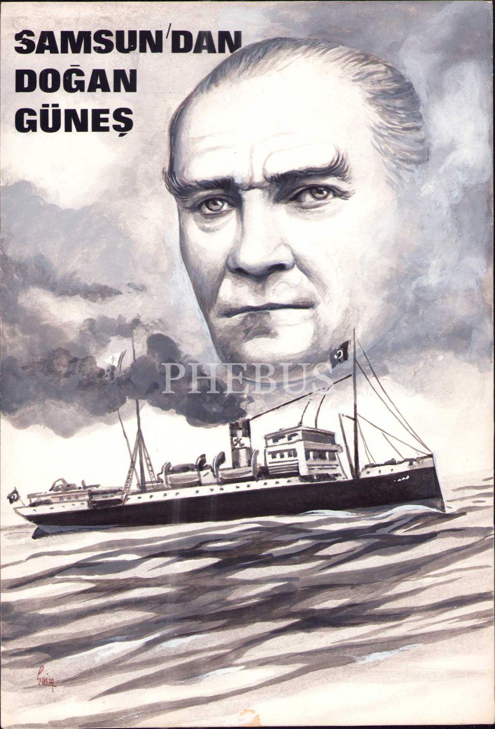 Bandırma Vapuru ve Atatürk görselli orijinal çizim, 21x31 cm