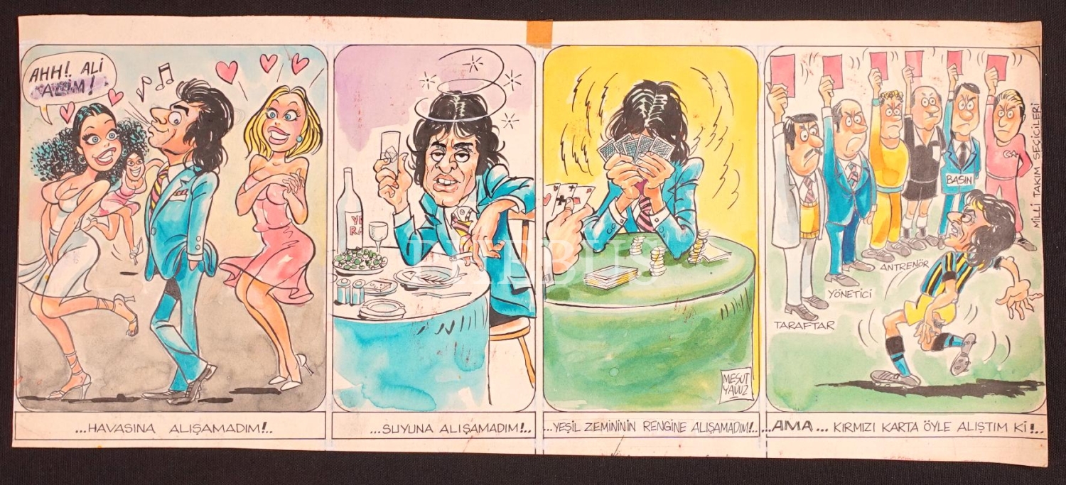Mesut Yavuz imzalı futbol-kırmızı kart konulu karikatür, 20x47 cm