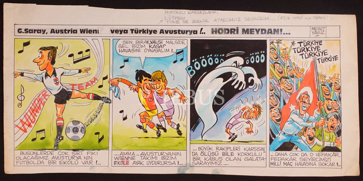 Mesut Yavuz imzalı Türkiye- Avusturya maçı konulu karikatür, 23x50 cm