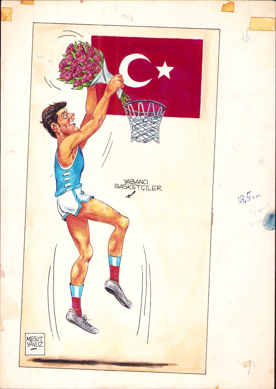 Mesut Yavuz imzalı basketbol konulu karikatür, 24x35 cm