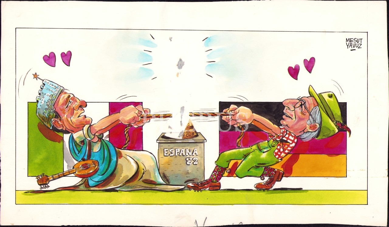 Mesut Yavuz imzalı "Espana 1982 Fifa Dünya Kupası" konulu karikatür, 21x37 cm