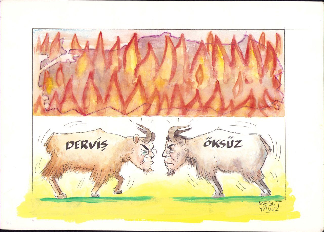 Mesut Yavuz imzalı teknik direktör Derviş ve Öksüz konulu karikatür, 25x35 cm