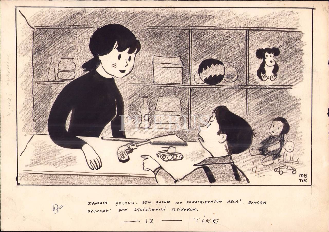 Karikatürist Mıstık imzalı "Zamane Çocuğu" konulu karikatür, 21x30 cm