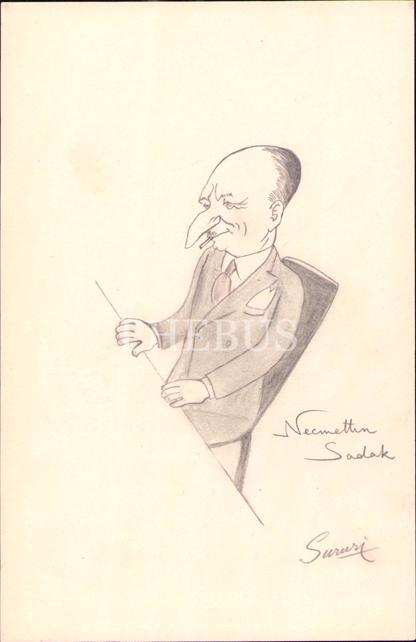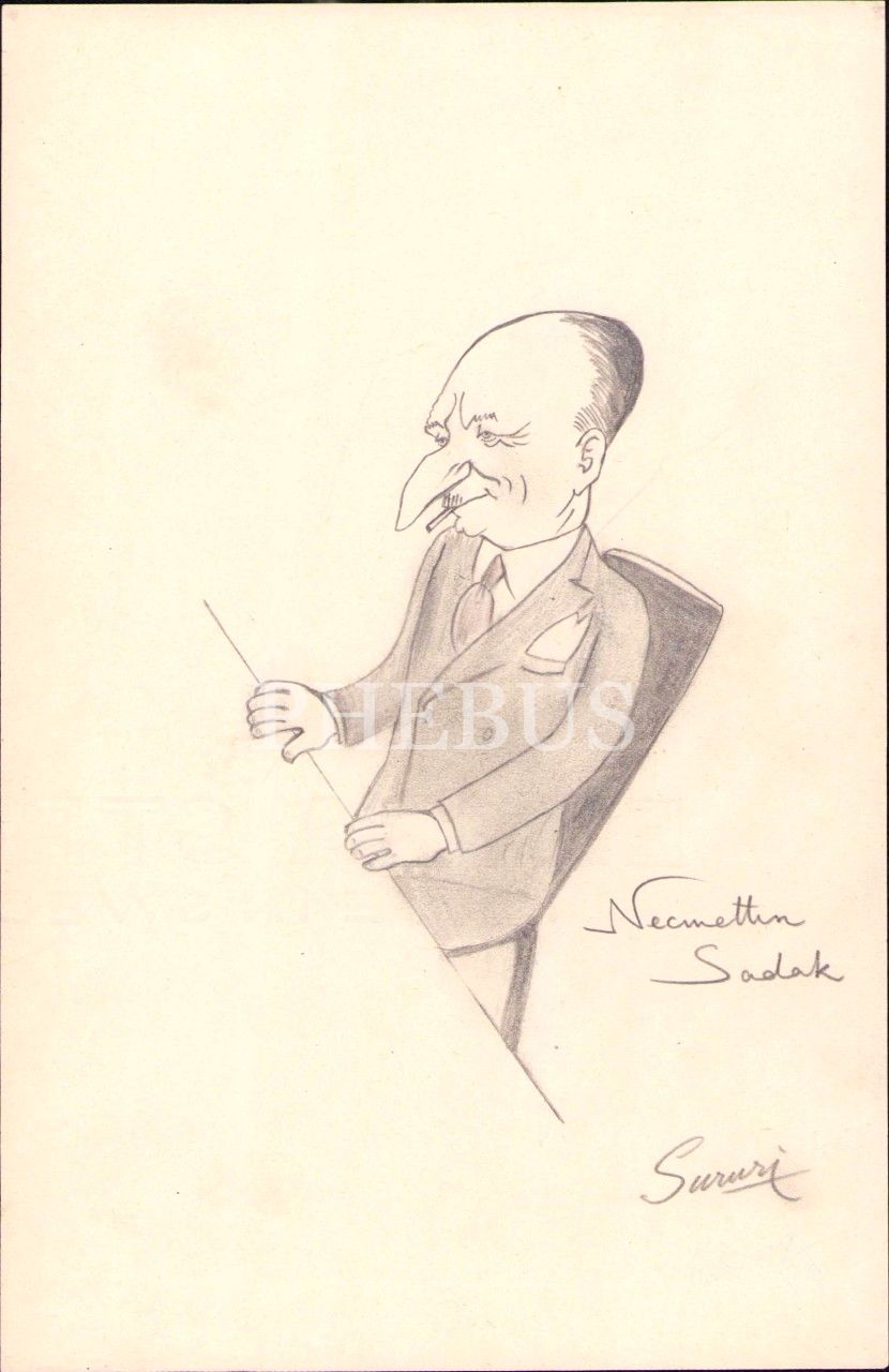 Sururi Gümen imzalı Necmettin Sadak konulu karikatür, 14x21 cm