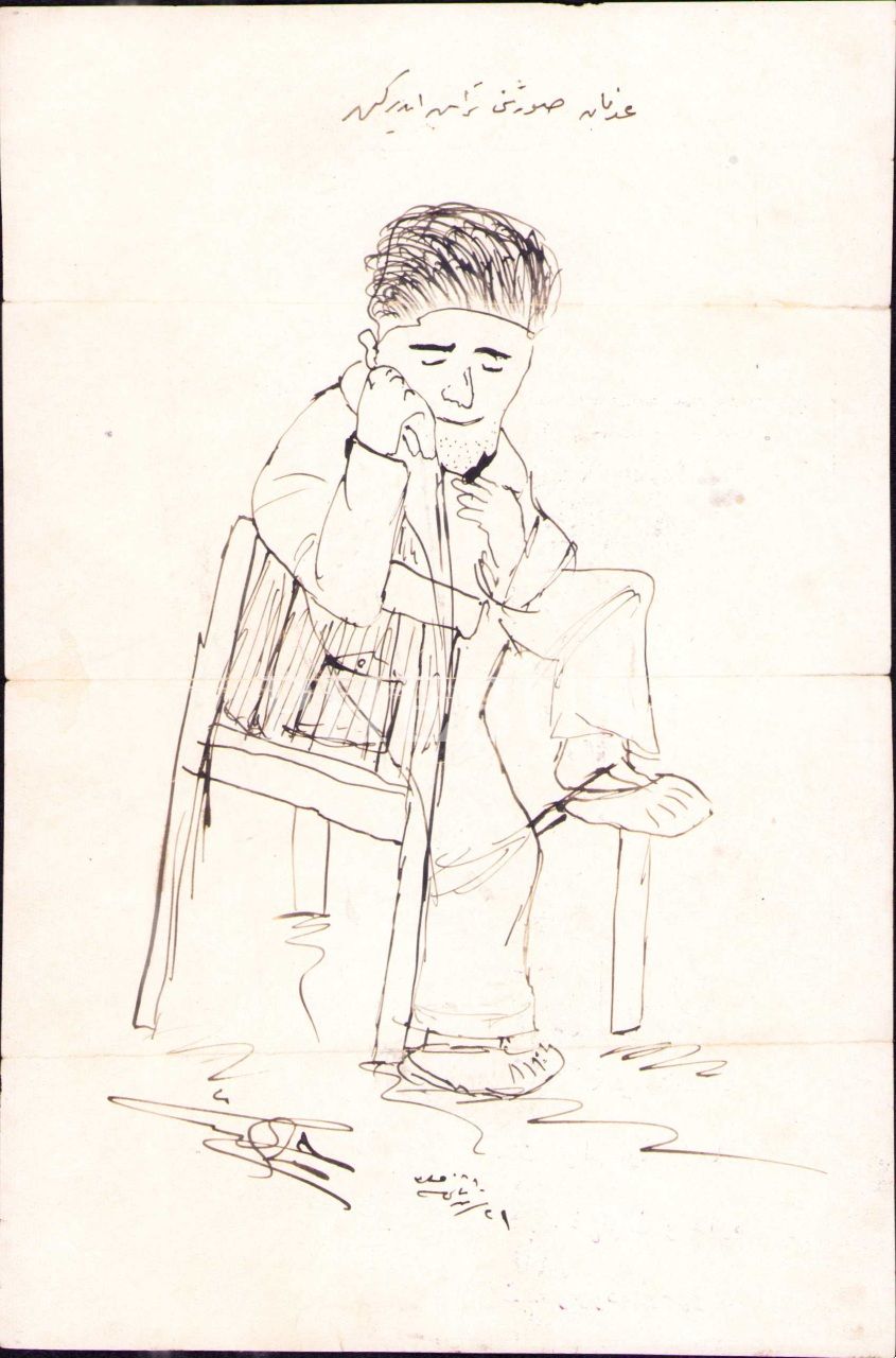 İmzalı, Osmanlıca "Adnan suratını traş ederken" yazılı karikatür, 14x21 cm
