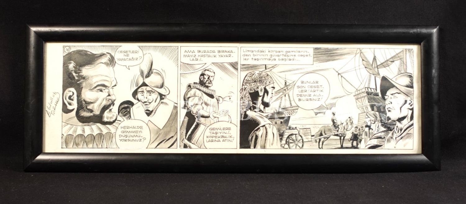 Abdullah Turhan imzalı, çerçeveli karikatür, 18x50 cm