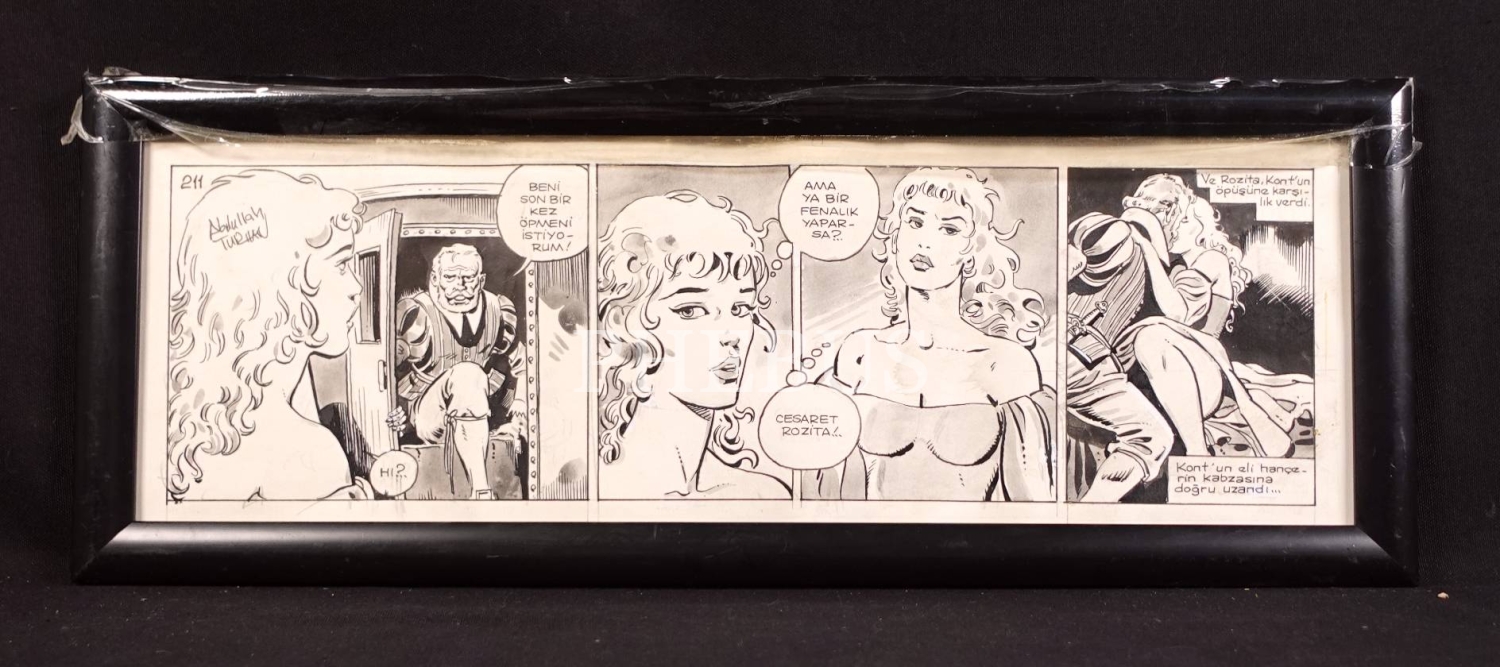 Abdullah Turhan imzalı, çerçeveli karikatür, 18x49 cm