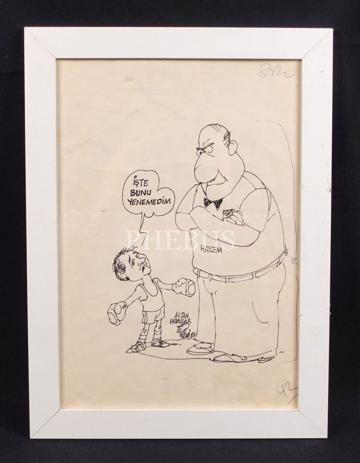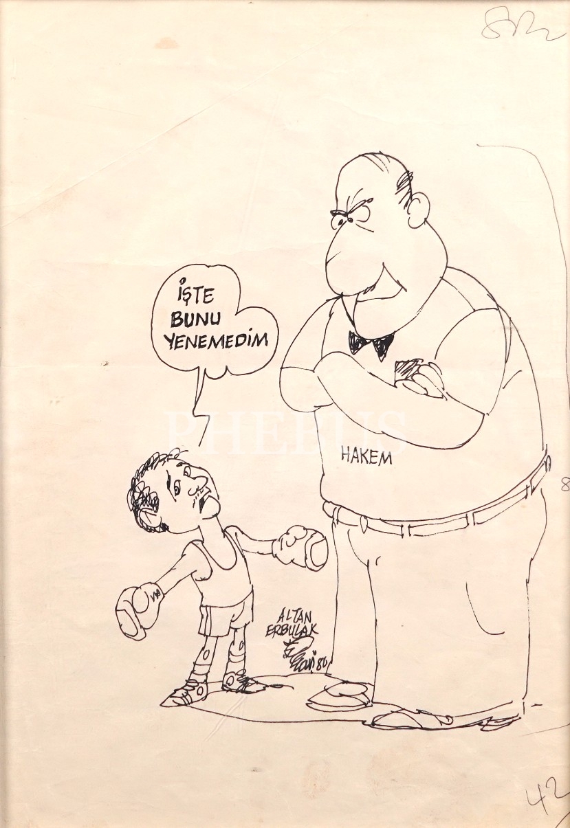 Altan Erbulak imzalı, çerçeveli karikatür, 24x33 cm