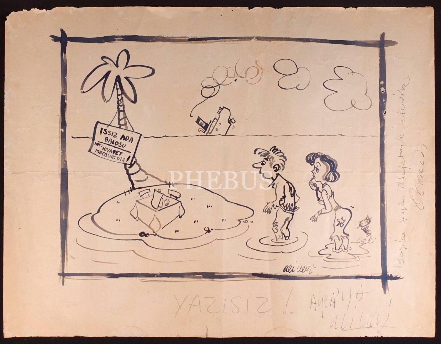 Ali Ulvi imzalı "Issız Ada Balosu" konulu karikatür, 50x65 cm