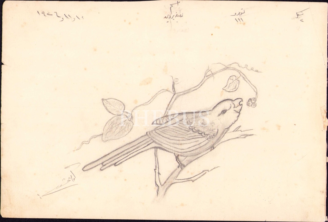 Osmanlıca Lütfiye Pervin notlu ve imzalı karakalem kuş çalışması, 1926 tarihli, 18x25 cm