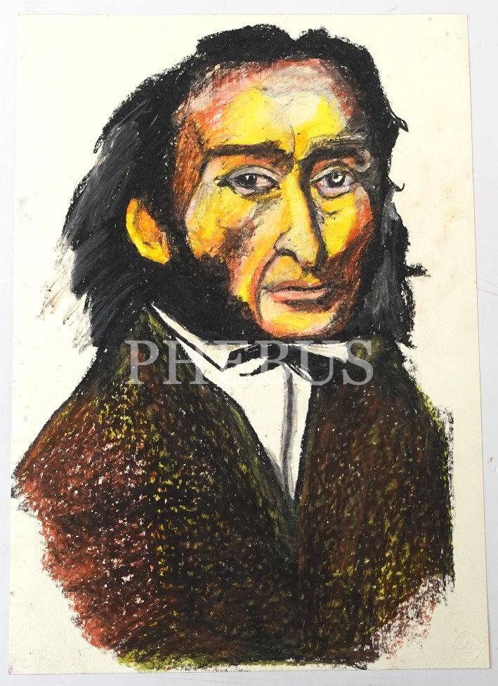 Ressam Kerem Öztürk imzalı kağıt üzerine pastel boya Niccolo Paganini portresi, 35x50 cm