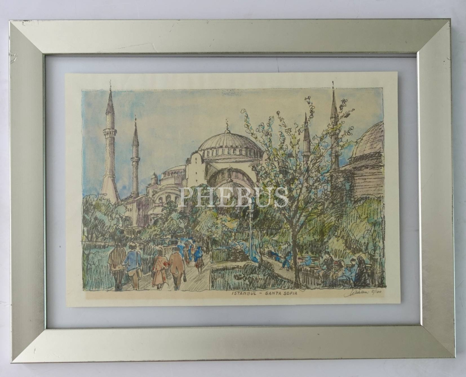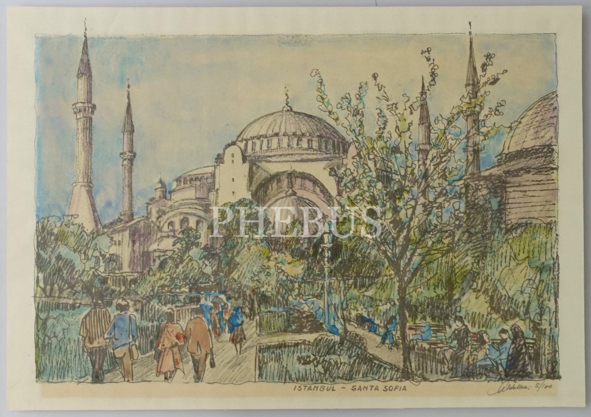 Kağıt üzerine özgün baskı sulu boya Ayasofya manzaralı tablo, İtalyan ressam Aldo Mari imzalı, 65x85 cm