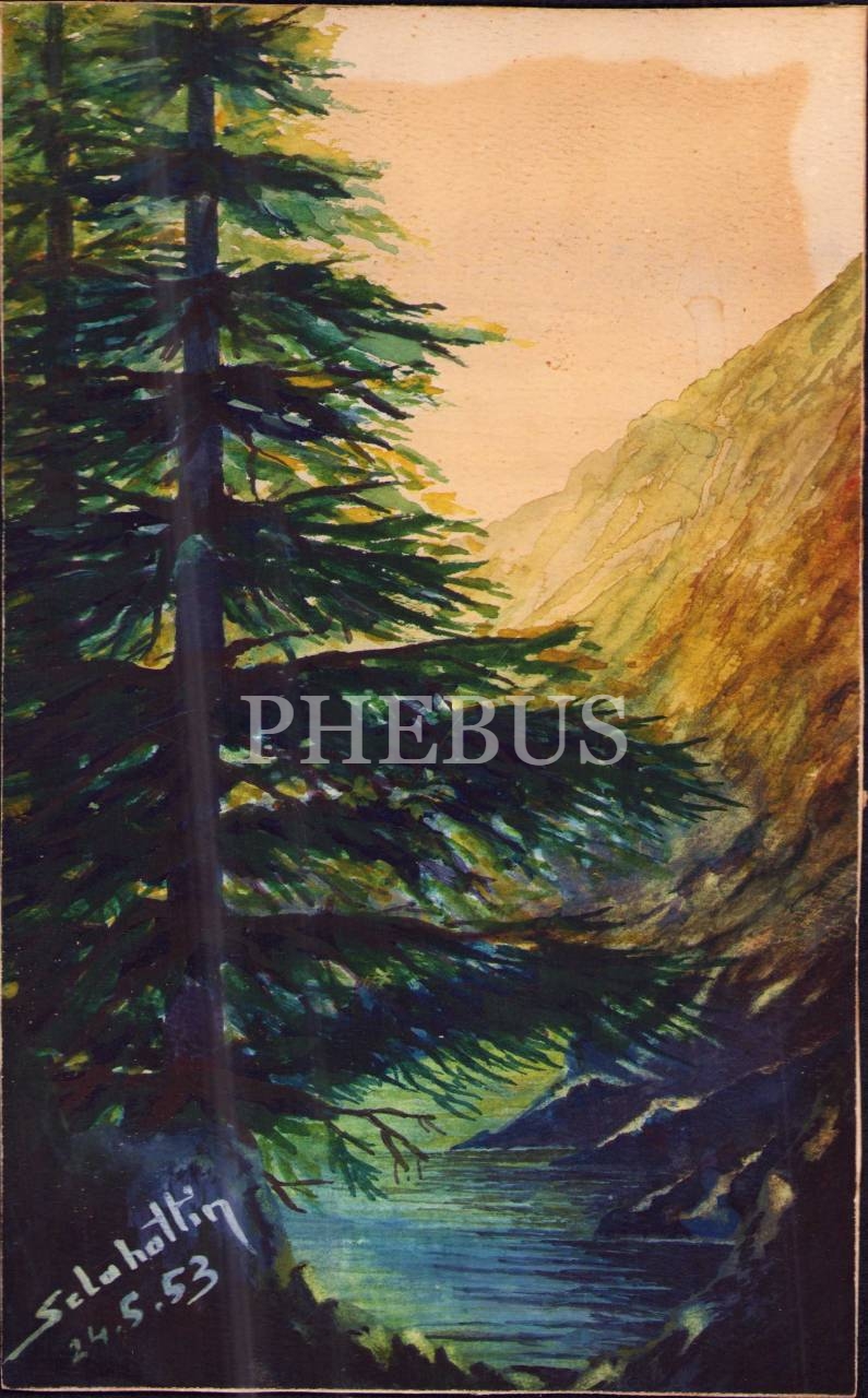 Kağıt üzerine yağlı boya manzara resmi, imzalı, 1953 tarihli, 14x23 cm