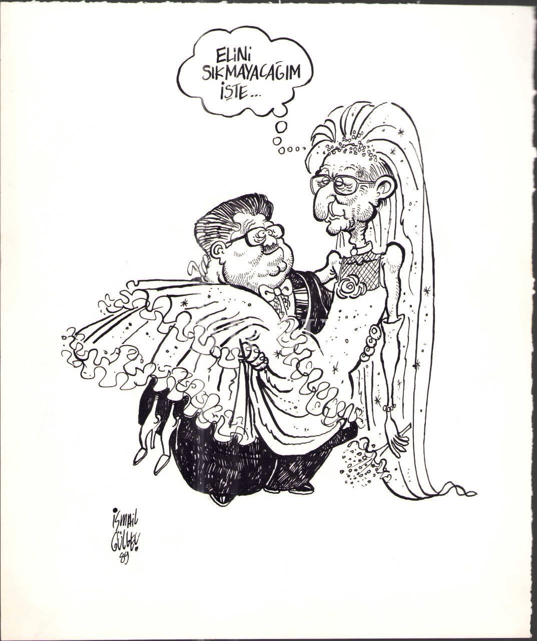 Siyasi Tarih: ismail Gülgeç 89 imzalı Turgut Özal konulu karikatür, 25x30 cm