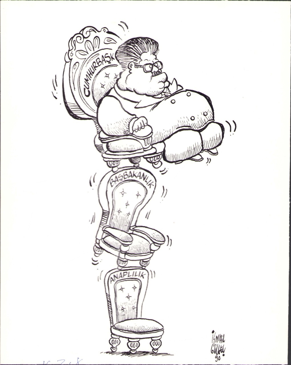 Siyasi Tarih: ismail Gülgeç 90 imzalı Turgut Özal konulu karikatür, 25x30 cm