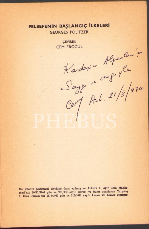 FELSEFENİN BAŞLANGIÇ İLKELERİ, Georges Politzer, çev. Cem Eroğul'dan ithaflı ve imzalı, 1974