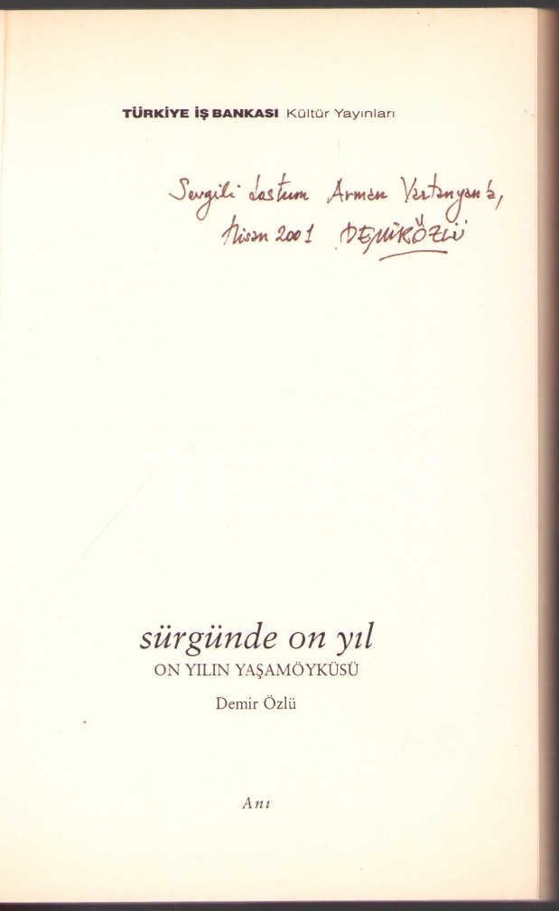 Demir Özlü'den ithaflı ve imzalı, SÜRGÜNDE ON YIL, 2001
