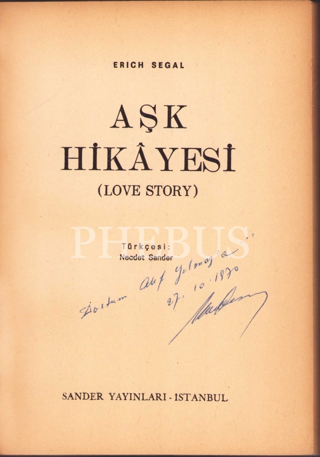 AŞK HİKAYESİ, Erıch Segal, çev. Necdet Sander'den Atıf Yılmaz'a ithaflı ve imzalı, 1970, kapak köşesi kopuk haliyle