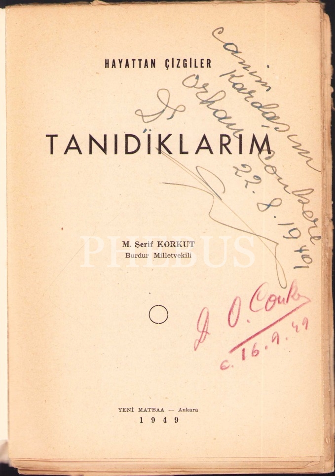 M. Şerif Korkut'tan ithaflı ve imzalı HAYATTAN ÇİZGİLER TANIDIKLARIM, 1949